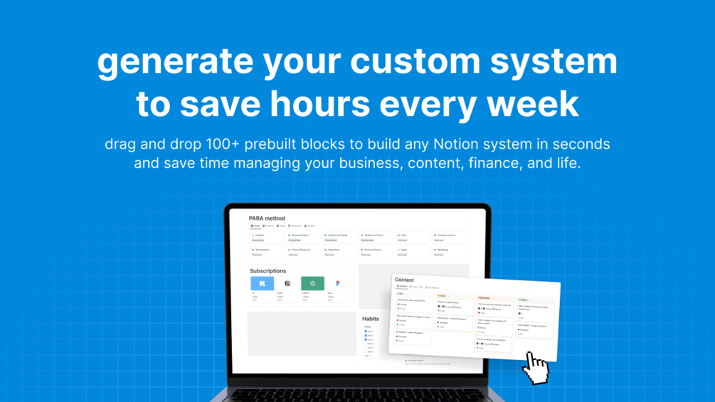 Blueprint for Notion is a drag and drop system generator that will build your custom Notion system in seconds, so you can save time as you manage your business, content, finance, and life.
